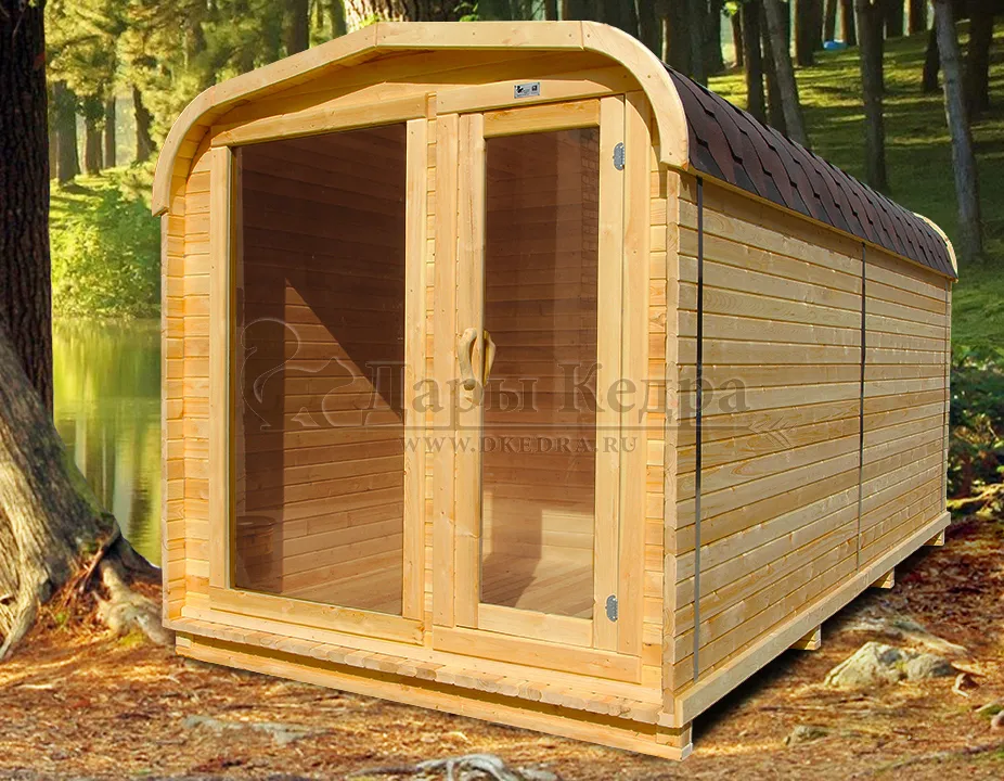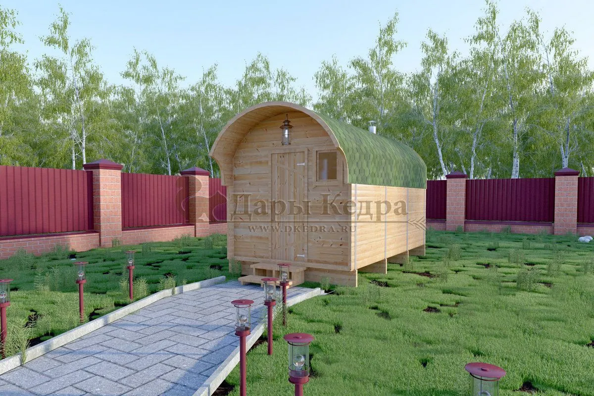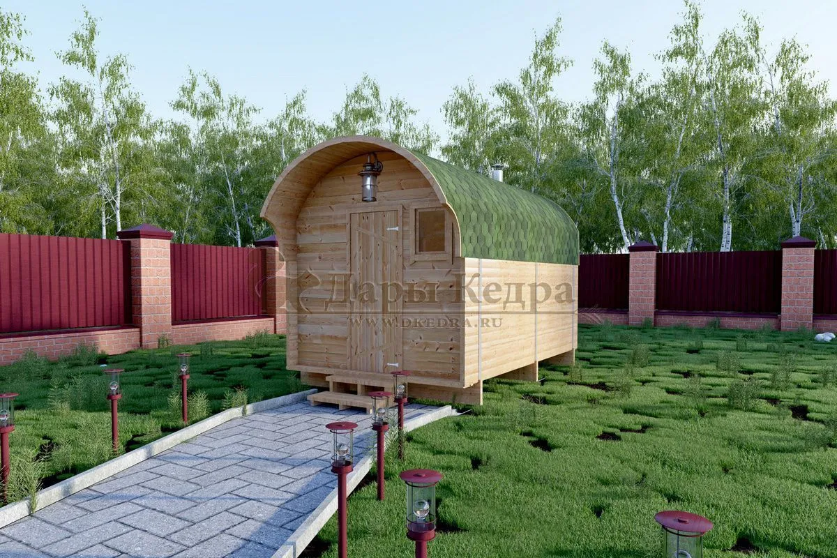 Симбиоз круглой и квадратной бани-бочки. Разработано с учётом эргономики, в ней так же просторно, как и в квадро-бочке, но при этом полукруглая крыша не дает задерживаться снегу и влаге на кровле. А еще такая баня безусловно красивая, мобильная и доступная каждому!