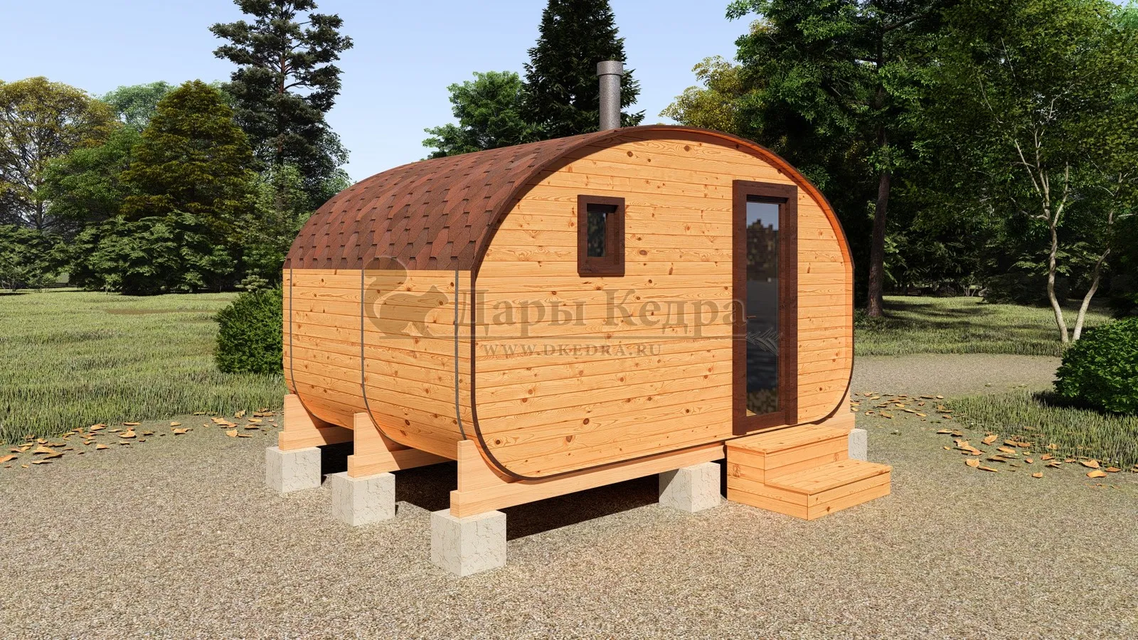 Баня-бочка круглая из кедра 3 метра Это изделие круглой вытянутой формы с двумя отделениями: раздевалкой и парной. Лавочки из кедра находятся по всей длине бани-бочки с обеих сторон. Печь расположена в парилке около дальней стены. Для удобства пользования в раздевалке установлена вешалка и полочка из кедра. За счет небольшой конструкции баня нагревается не более 30 минут. По вашему желанию баню-бочку можно дополнить печью с внешней загрузкой, благодаря которой весь мусор после топки останется на улице. Круглая баня-бочка не требует полноценный фундамент, поэтому при необходимости ее можно перенести в другое место. Обращаем Ваше внимание, что в стандартную комплектацию бани входят лавки в парной с обеих сторон. Дополнительно можно заказать полок открытого или закрытого типа! Кедр обладает ароматическими свойствами. Он не деформируется и влагоустойчив, при правильном уходе за деревом на нем не развиваются грибки и плесень.