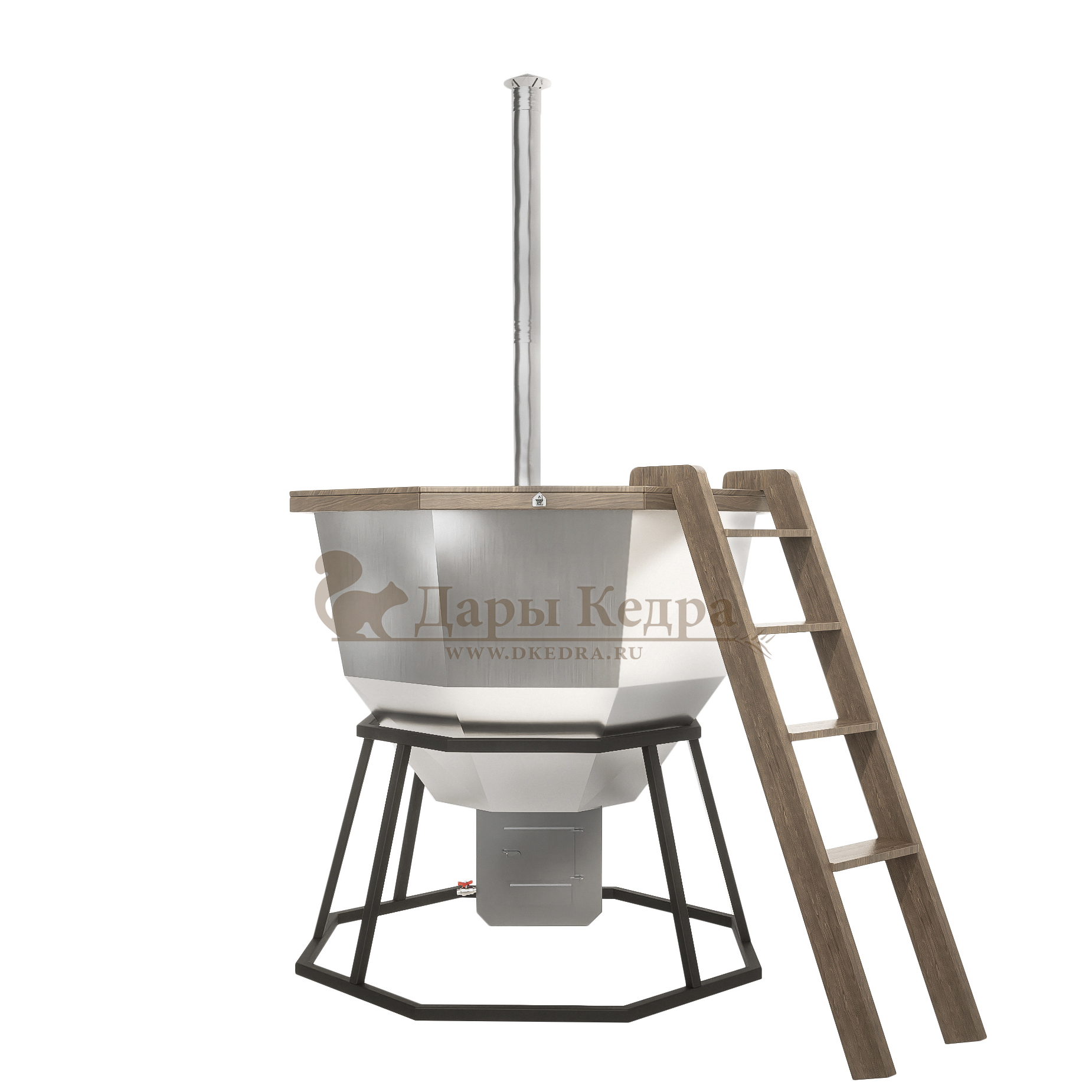 Банный чан из нержавеющей стали Ø-2000 на подставке с приварной печью с водяной рубашкой Банный чан с приварной печью печкой изготовлен из пищевой стали. Представляет собой большую ёмкость в виде чаши, при нагревании которой можно париться на свежем воздухе. Банный чан установлен на металлическую подставку и оснащен приварной печью с водяной рубашкой. Благодаря циркулирующей внутри печи воде чан быстрее нагревается и медленнее остывает. В комплект такой модели входит трёхметровый разборный дымоход. Чан оборудован кедровым бортом, скамейками, подспинниками, трапом для ног и приставной лестницей.