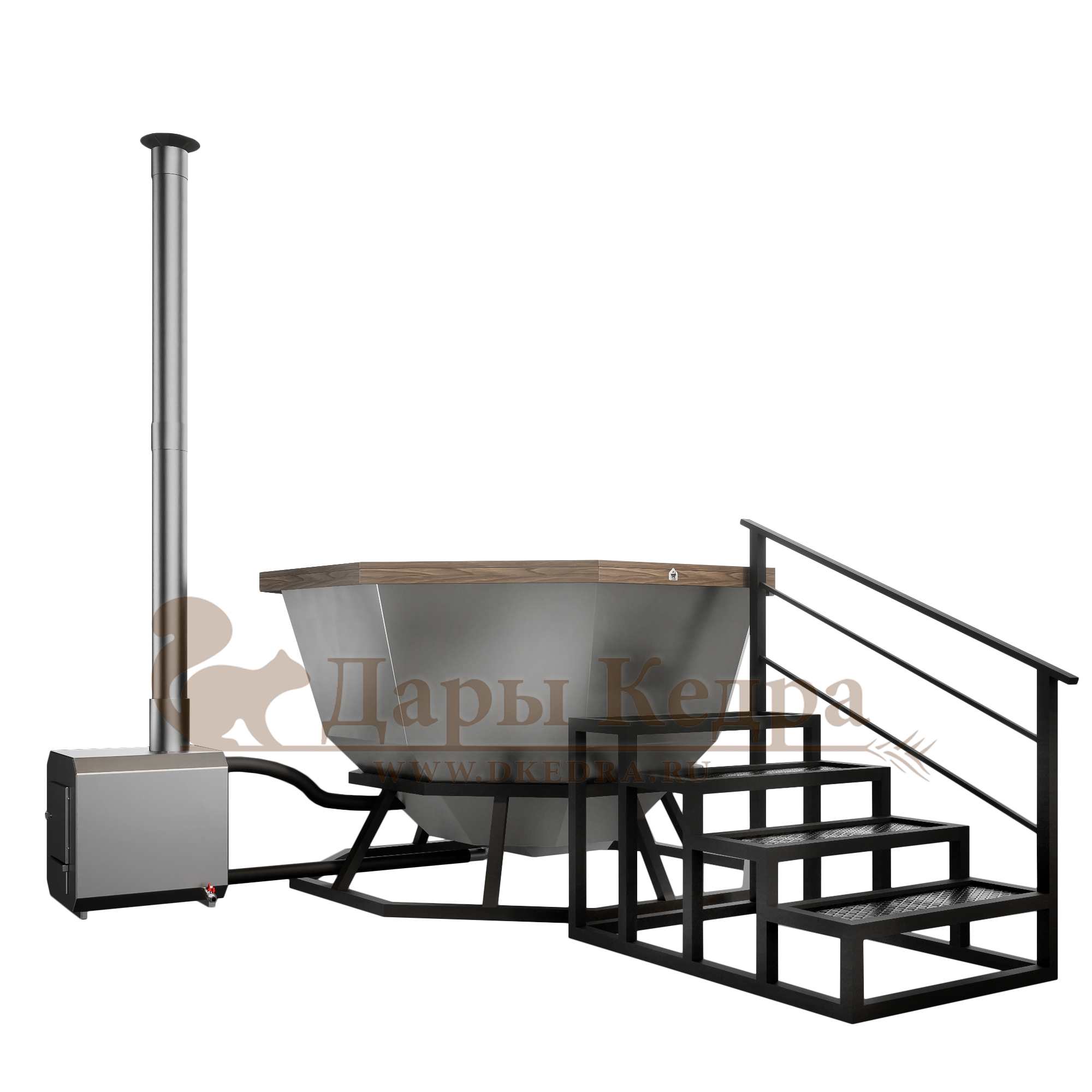 Банный чан из нержавеющей стали Ø-2350 на подставке с приставной печью Банный чан с приставной печкой изготовлен из пищевой стали. Представляет собой большую ёмкость в виде чаши, при нагревании которой можно париться на свежем воздухе. Чан установлен на устойчивую металлическую подставку и оснащен приставной печью с дымоходом. Банный чан оборудован кедровым бортом, скамейками, подспинниками, трапом для ног и приставной лестницей.