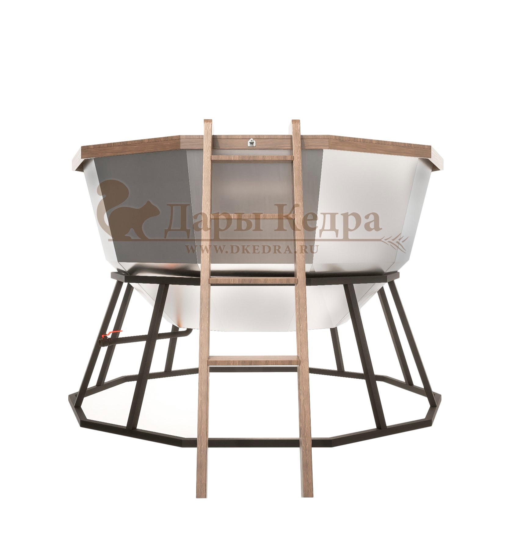 Банный чан из нержавеющей стали Ø-2350 на подставке Банный чан на подставке изготовлен из пищевой стали. Представляет собой большую ёмкость в виде чаши, при нагревании которой можно париться на свежем воздухе. Чан установлен на устойчивую металлическую подставку и оборудован кедровым бортом, скамейками, подспинниками, трапом для ног и приставной лестницей. Нагревание банного чана происходит от обычного костра. Если оборудовать данную модель печью, то банные процедуры можно принимать даже зимой.