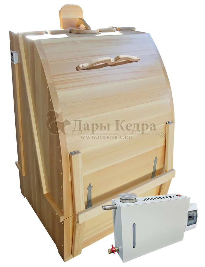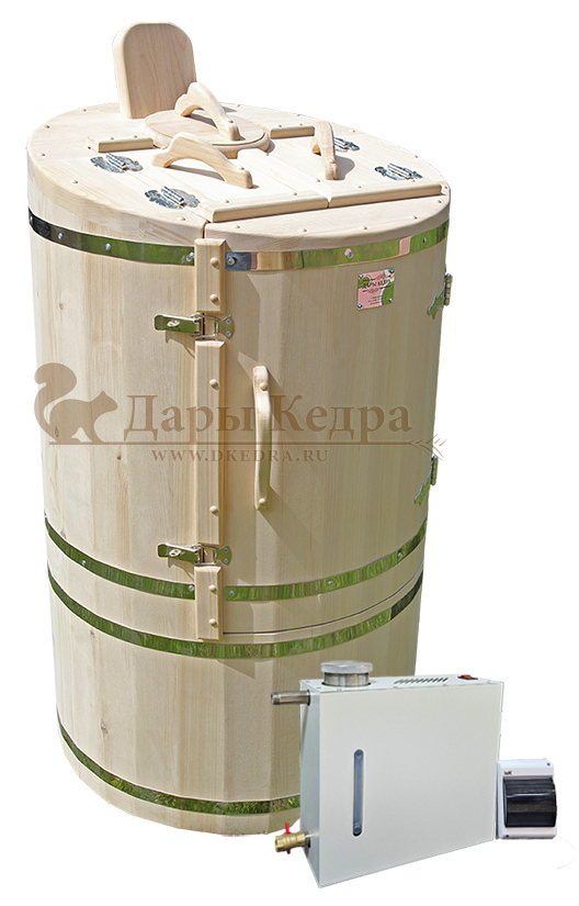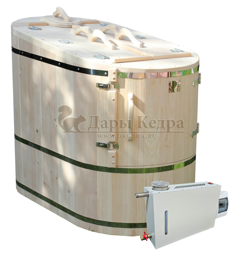 • Готовый комплект «Удобный+»: кедровая бочка с парогенератором + био-защита изнутри и снаружи Готовый комплект - это полностью укомплектованный набор с фитобочкой для процедур парения. Овальная модель более просторна и удобна в использовании. Толщина стенок составляет 25 мм. Бочка оборудована откидными створками, дверцей и отверстием для головы. Верхний скос изделия делает положение головы более комфортным и улучшает обзор. Во время парения человек сидит внутри кедровой бочки, а голова находится снаружи. Благодаря этому исключается возможность перегрева. Подлокотники из кедра, встроенные ручки на створках и двери делают эксплуатацию более удобной. Парение в фитобочке благотворно влияет на организм в целом: повышается иммунитет, выводятся шлаки и токсины, улучшается работа органов тела и состояние кожи.