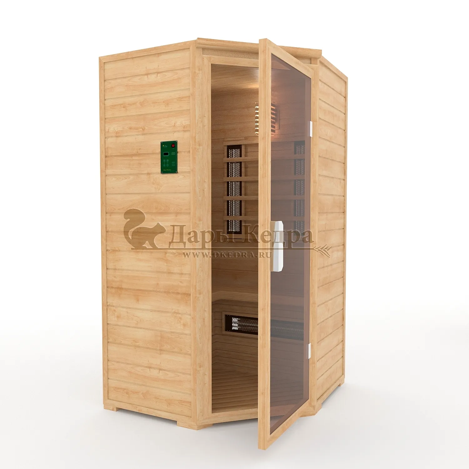Двухместная угловая инфракрасная сауна кабина из кедра и липы с керамическими излучателями Это специально оборудованная кабина из липы для прогрева тела человека сухим теплом. Воздух в таких парных не нагревается. Инфракрасные лучи воздействуют на тело, равномерно прогревая мышцы, суставы и органы. Керамические излучатели похожи на лампы, имеют высокую температуру нагрева, поэтому защищены противоожоговыми решетками. Тело человека в таких саунах нагревается интенсивнее. Работает кабина за счет электричества. Установка сауны в угол, позволяет рационально использовать пространство помещения. Подходит как для домашнего использования, так и для коммерции. Обращаем Ваше внимание что в стандартную комплектацию входит трапик для ног, но вы можете его заменить на цельный пол совершенно бесплатно! Целебная древесина кедра и инфракрасные лучи благотворно влияют на организм человека в целом. При регулярном использовании инфракрасной сауны укрепляется иммунитет, улучшается кровообращение и состояние кожи, выводятся токсины.