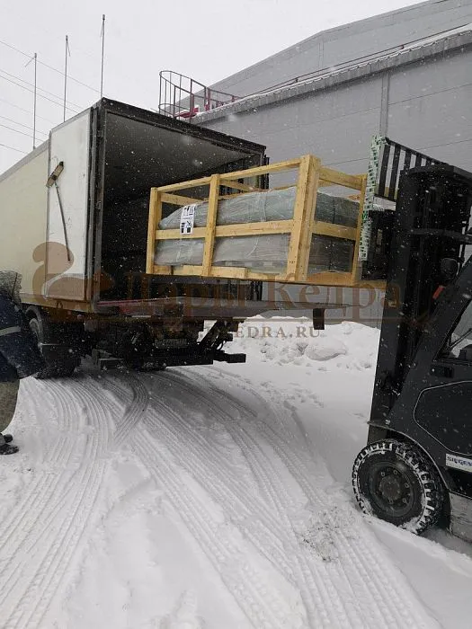 Сборный или разборный вид бани доставляется на место установки непосредственно на самогрузе (манипуляторе) или длинномере с последующей разгрузкой манипулятором. Изделие разгружается на подготовленное заранее место. Для разборного вида изготавливается специальная обрешетка груза. Её необходимо самостоятельно снять перед началом разгрузки изделия.
