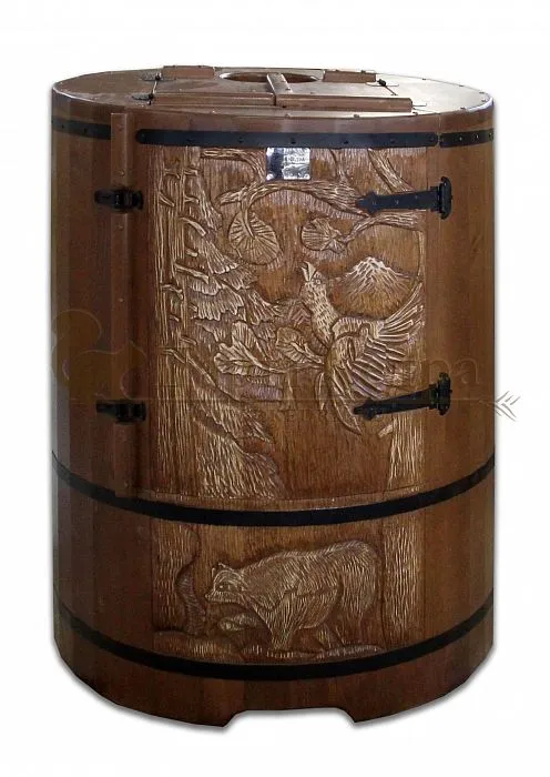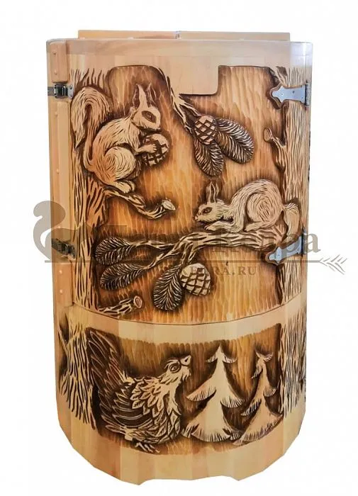 И, конечно, стоит отметить мастеров компании, осуществляющих профессиональную резьбу на древесине фитобочки или купели. Изделие с художественным оформлением - это выбор ценителей красоты, индивидуальности, эко-стиля. Бочка с резьбой станет объектом всеобщего внимания. Можно выполнить тонирование рисунка или окрашивание всей бочки в круговую и выделение рисунка сделать отдельно с помощью осветления. Таким образом, более светлый контур резьбы будет смотреться очень ярко на темной фитобочке. Все работы по художественному оформлению проводятся мастерами вручную, никаких станков!