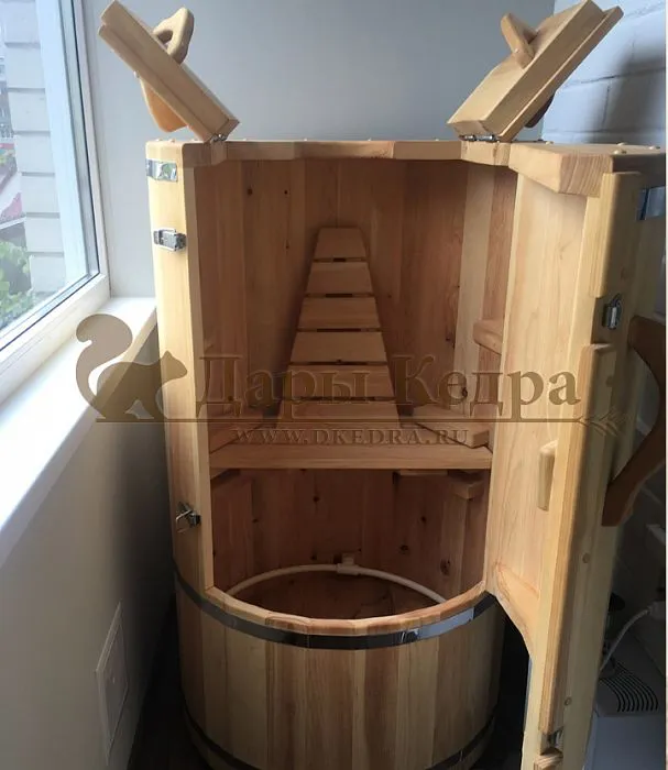 Еще одним вариантом размещения домашней мини - бани даже в самой маленькой квартире является балкон или лоджия. Если балкон застеклен и утеплен, то это создаст комфортные условия при принятии процедур зимой и поздней осенью. Также необходимо позаботиться о подведении электричества к балкону. Размещение парной на балконе сэкономит место в квартире, создаст уют и наполнит помещение ароматом кедра.